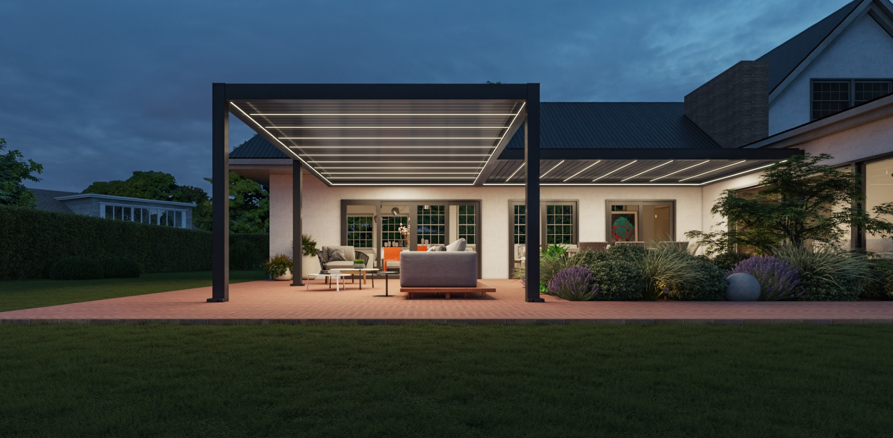 - Bei geschlossenem Lamellendach wird das Regenwasser über das integrierte Entwässerungssystem abgeführt. Die innenliegenden Dachrinnen sowie die Leitungen innerhalb der Säulen gehören zur Standardausstattung unserer Pergolen. Damit kann auch bei Regen unter der Pergola im Trockenen entspannt werden.